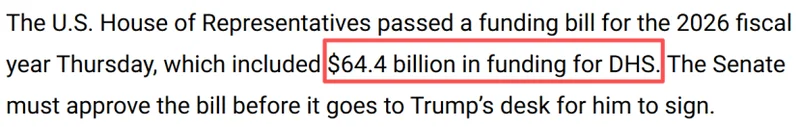 美国众议院已于周四通过2026财年拨款法案,其中包括为国土安全部提供644亿美元资金,参议院仍需批准后才能提交给特朗普签署。