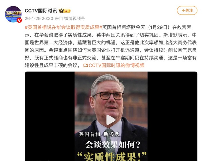 英国首相斯塔默今天(1月29日)在故宫表示,在华会谈取得了实质性成果,英中两国关系得到了切实巩固。 斯塔默表示,中国是世界第二大经济体,蕴藏着巨大的机遇,这正是他此次率领如此庞大商务代表团的原因。会谈重点围绕如何为英国企业打开机遇通道,会谈持续时间长且气氛良好,既有正式磋商也有非正式交流,甚至在午宴期间仍在持续沟通,这是一场富有建设性且成果丰硕的会议。