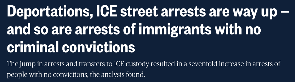 报告还指出,虽然ICE拘押的总人数有所增加,但被捕者中有犯罪定罪记录的人占比明显下降。无犯罪记录者的被捕人数较此前增长了七倍,显示执法重点已经不再主要集中在“有犯罪背景”的移民群体。