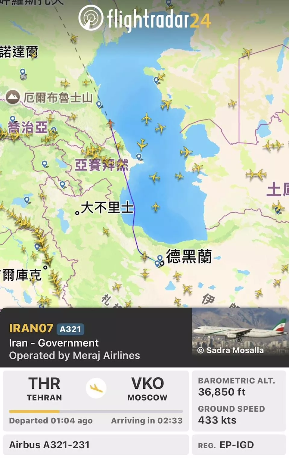 中东局势进入高度戒备状态。根据航班追踪网站 Flightradar24 资讯,一架呼号为IRAN07、编号EP-IGD的伊朗政府空中巴士A321专机,于当地时间29日由德黑兰起飞,目的地为俄罗斯莫斯科。由于该机队由美拉吉航空(Meraj Airlines)代管,过去经常由伊朗政府使用,再加上日前曾经爆出伊朗最高领袖哈梅内伊早已拟定逃亡莫斯科计划,在目前美伊关系紧绷、冲突一触即发之际,此航迹引发外界高度关注。