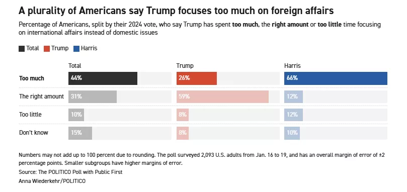 但在2024年投票支持川普的选民中,59%认为他在国际问题上投入的时间恰到好处,只有26%担心他过于关注海外事务。
