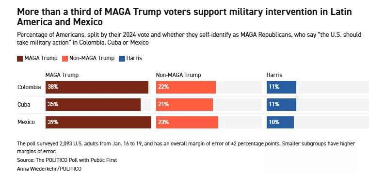 32%的川普选民支持对墨西哥进行军事干预,30%支持对哥伦比亚动武,28%认为美国应对古巴采取军事行动。
