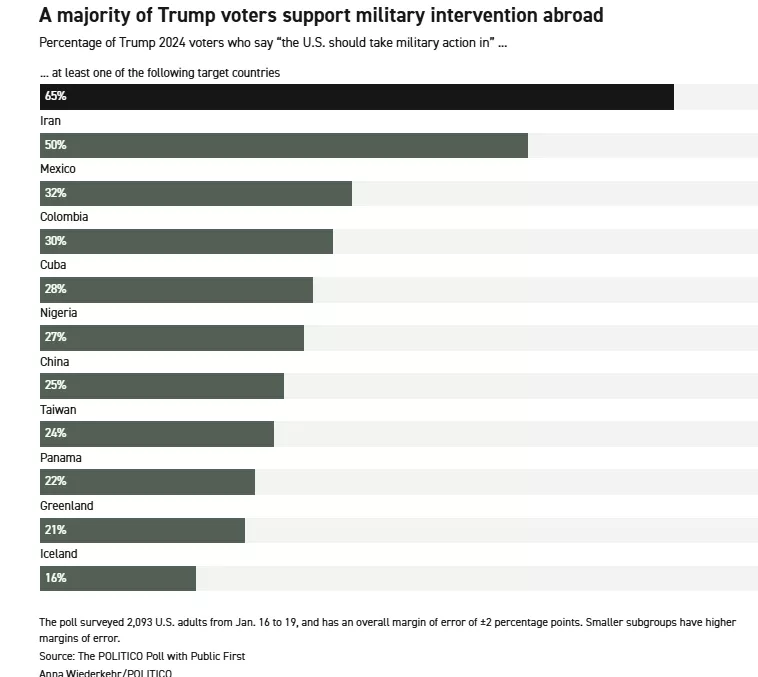 POLITICO与总部位于伦敦的独立民调机构Public First联合进行的最新民调显示,65%的川普选民,支持美国对至少一个潜在目标国家采取军事行动,包括伊朗、格陵兰(丹麦)、古巴、哥伦比亚、中国和墨西哥。