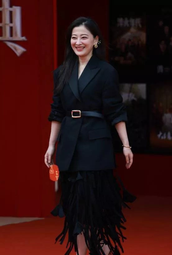 她的造型同样也与剧中的形象呼应,藏蓝色的长裙搭配西装外套,一头黑长直,看起来更加利落干练。