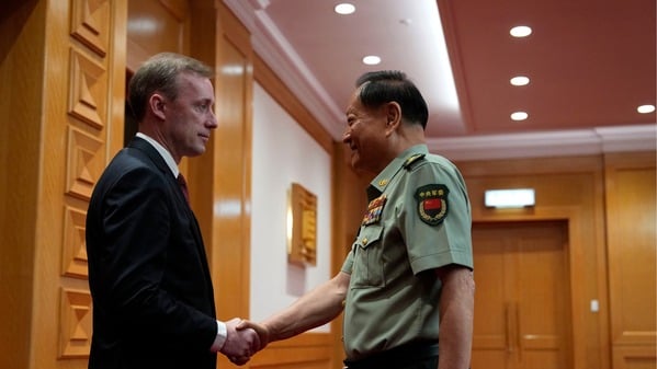 2024年8月29日,中共中央军委副主席张有侠在北京八一大厦会见美国国家安全顾问杰克·沙利文前握手。(图片来源:Getty Images)