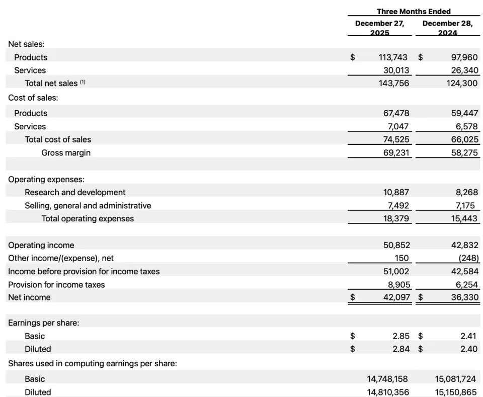 当地时间1月29日,苹果发布2026财年第一财季财报——营收1437.56亿美元,同比增长16%;净利润420.97亿美元,同比增长16%;摊薄后每股收益2.84美元,全面超出华尔街此前预期。毛利率升至 48.2%,不仅刷新近年高位,也在通胀与算力成本持续上行的背景下显得尤为难得。