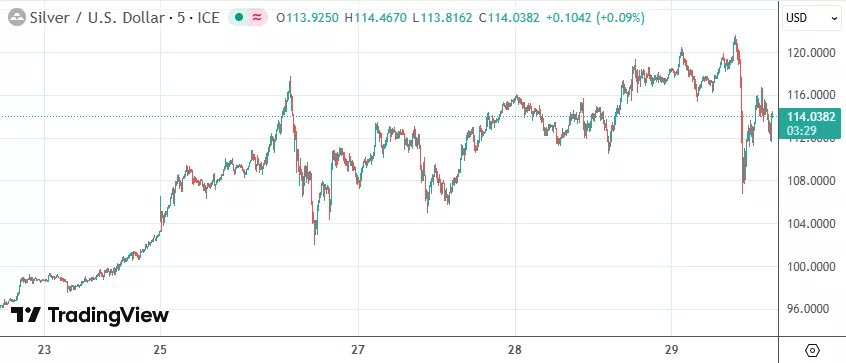 与此同时,现货银价从历史高位每盎司121.67美元跌至106.80美元,日内跌幅最大时为8.5%。截至发稿,银价反弹至每盎司114美元附近,跌幅收窄至2.3%左右。