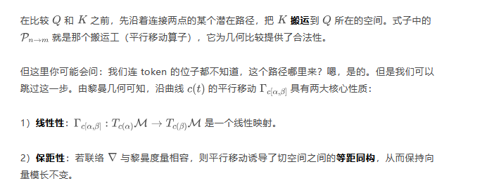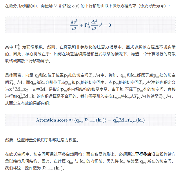 这相当于隐式地构建了沿 Token 序列的平行移动,从而在无需具体位置信息的情况下,实现了几何上合法的内积运算。也就是说,我们无心构建整个连续的流形,而是转向学习一个离散联络。