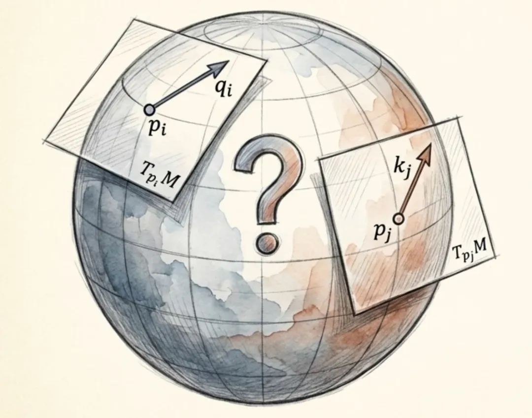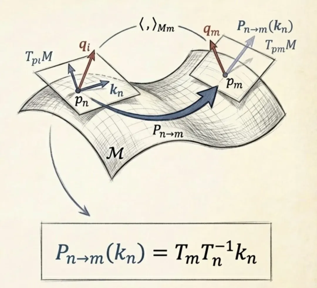我们的核心理念发生了根本转变:从外在几何转向内蕴几何。重要的不是 Token 在环境空间中的绝对坐标,而是它们之间如何通过变换建立联系。我们不再试图参数化绝对位置,而是专注于定义一种协议,使切向量(特征嵌入)能在离散点的切空间之间进行转换,即平行移动。