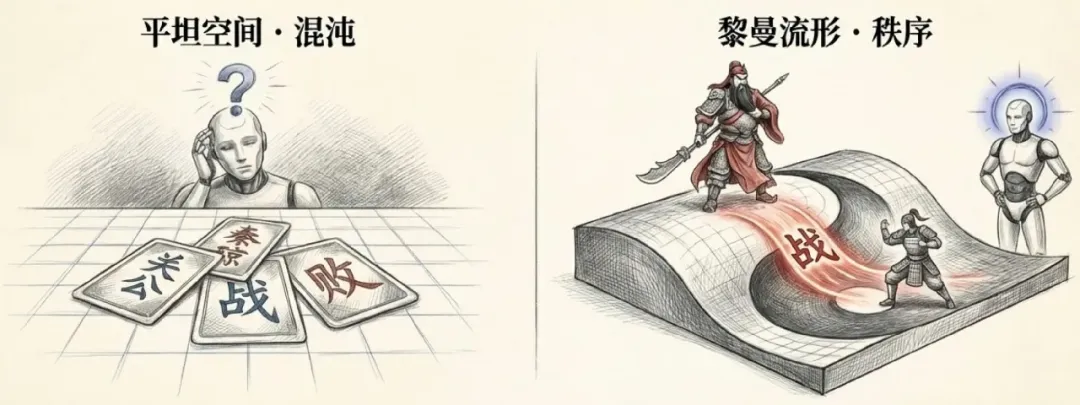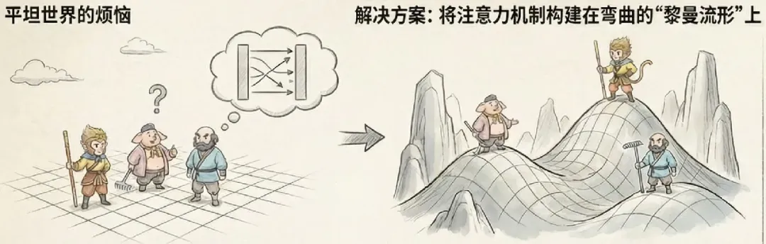 我们认为,Token(单词或图像块)不应该待在平坦的欧几里得空间里,而应该住在一个黎曼流形上。这是一个弯曲的空间,就像球面或者起伏的山峦。