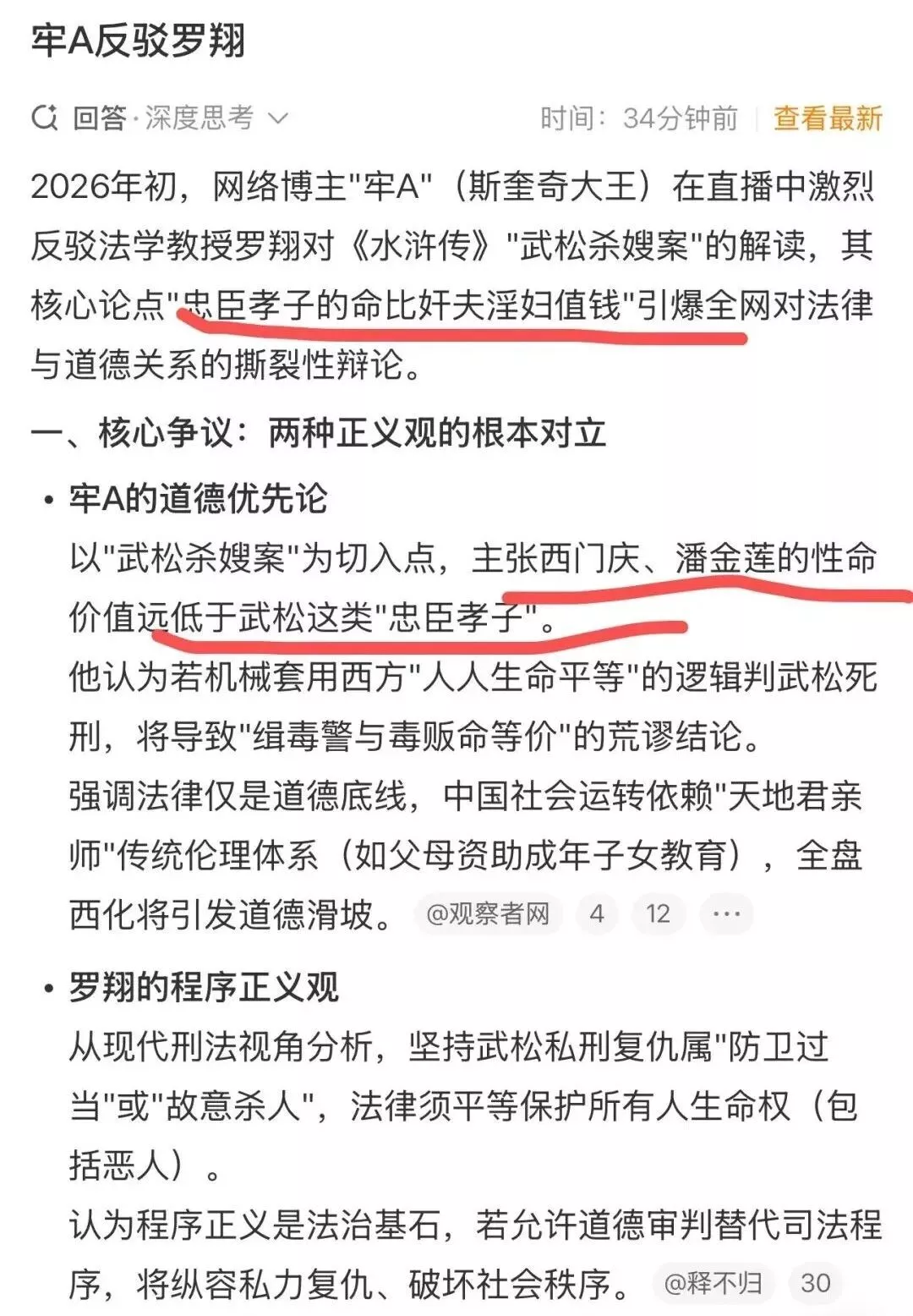 因为罗翔用武松杀潘金莲的历史典故阐述了现代法律,戏谑的结合到正当防卫防卫过当这个议题,结果这个戏谑就被牢A抓住了,而后反驳罗翔说:“忠臣孝子的命比奸夫淫妇值钱。”