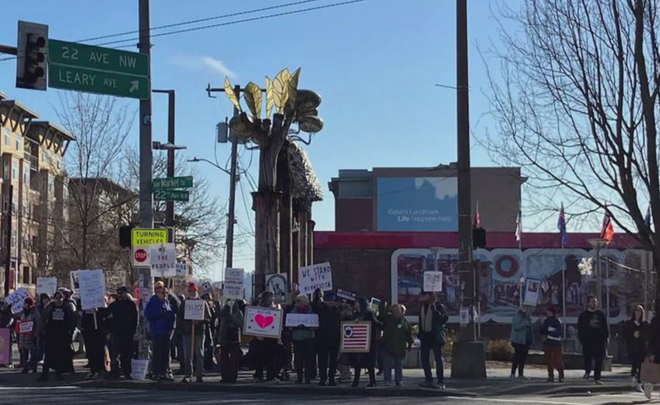 过去几个月来,这一团体就各类议题和事业举行集会。KING5获得的上周六集会现场照片显示,现场竖立着多块标语牌,反对美国移民与海关执法局(ICE)在明尼苏达州开展的行动。