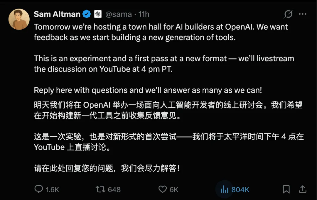 昨晚,Altman 在 X 上发帖称将举办一场线上研讨会,希望在开始构建新一代工具之前收集大众的反馈和意见。