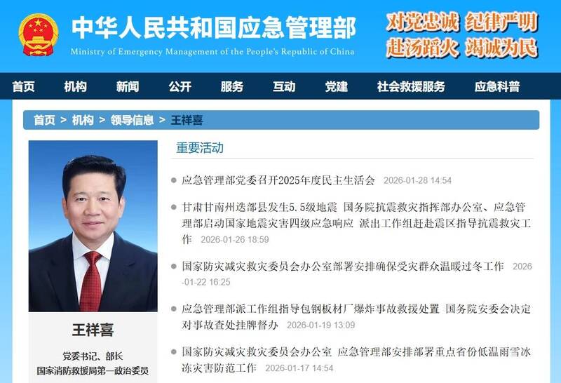 中国应急管理部部长王祥喜临时缺席央企安全生产工作视讯会议,盛传被带走调查。(撷取自中国应急管理部官网)
