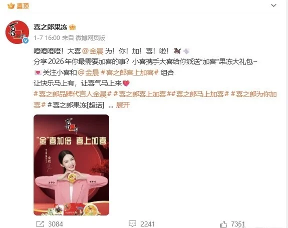 凤凰网《风暴眼》了解到,该账号曾于1月7日置顶发布金晨代言宣传,配文“喜之郎喜上加喜组合”并@金晨,官方微信公众号也于1月8日推送过相关代言推文,目前上述内容均已删除。