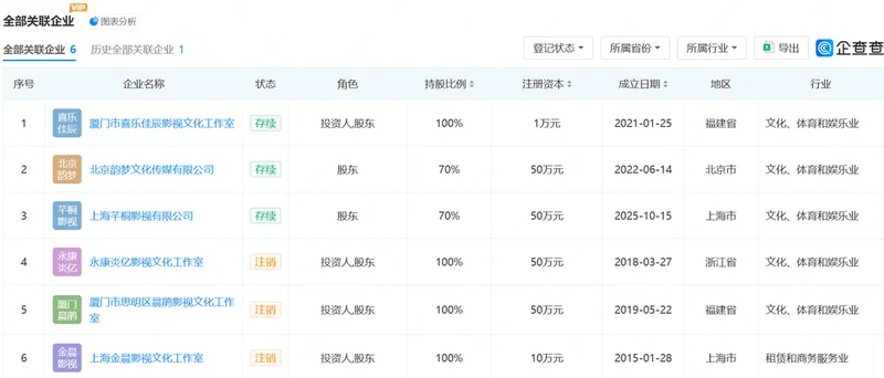 凤凰网《风暴眼》根据公开信息查到,她名下关联有6家企业,均围绕影视创作、艺人经纪等核心业务展开,注册资本适中,以轻资产运营为主,未出现高风险关联记录。