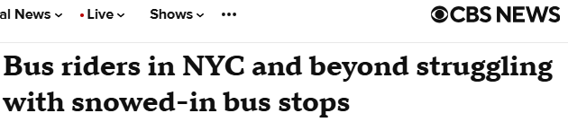 在威彻斯特县,许多Bee-Line公交候车亭同样因积雪而无法使用。该县表示,清理队伍正尽最大努力加快进度。