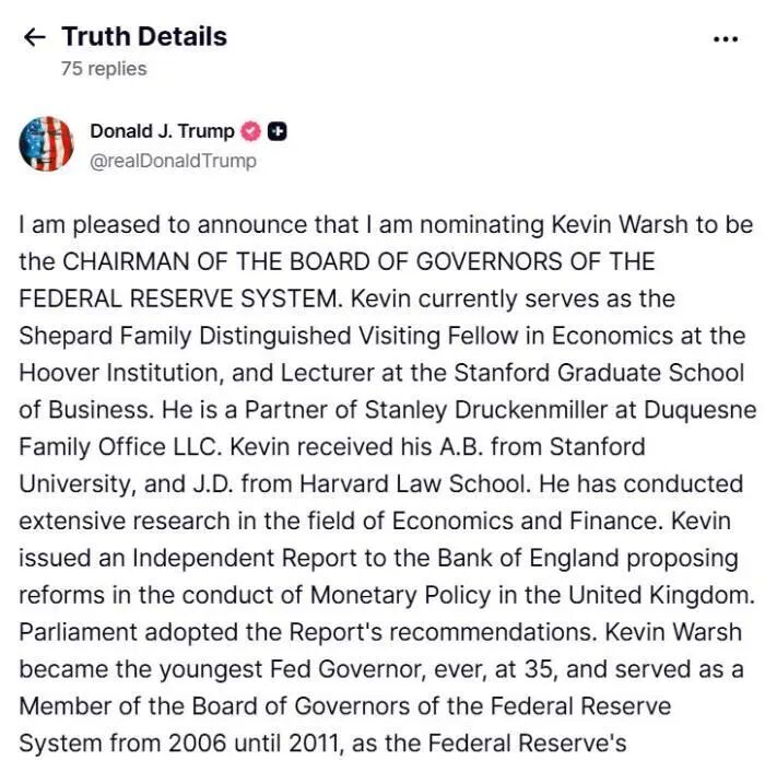 美国总统特朗普30日提名美联储前理事凯文·沃什为下任美联储主席,这一提名还需获得参议院批准。