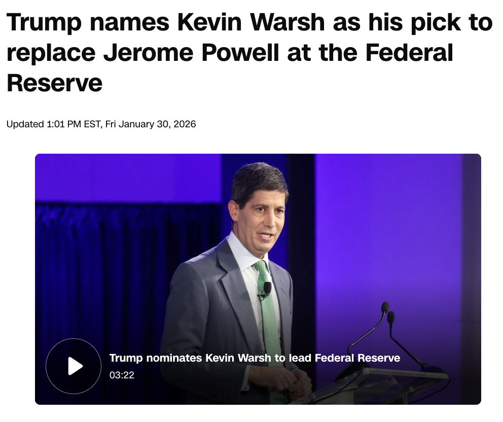 现任美联储主席鲍威尔的任期将于5月结束,沃什的任命尚需参议院确认。