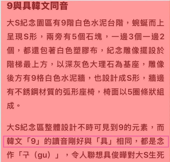 从现场流出的照片看,虽然看着简单,但每个细节都透露出具俊晔对大S满满的爱意。比方说,那由九块白色台阶拼成的“S”形造型,本身就别有用意。S当然是代表徐熙媛,而那九块的“9”,在韩语里发音又和“具”很接近。这一巧思,真是用心良苦啊。