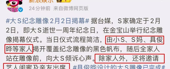 据台媒报道,大S的雕像在2月2日,也就是她去世一周年那天,举行揭幕仪式。整个流程挺简单,小S、S妈、具俊晔等家人会把遮着雕像的黑色帆布拉开,然后一家人站在雕像前面,向大S表达自己的心意。