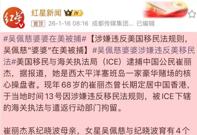不过,吴佩慈可能不一定会到场,毕竟她 lately烦心事不少,她“婆婆”崔丽杰因为涉嫌违反M国的移民(专题)法,被抓了个现行。