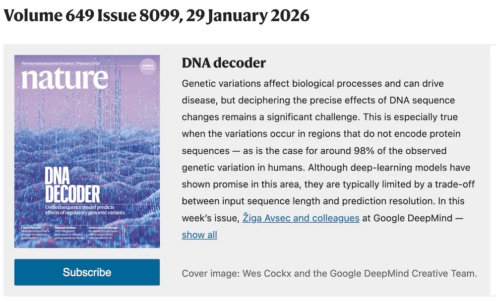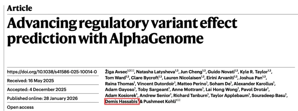 1月29日凌晨,2024年诺贝尔化学奖得主、谷歌DeepMind CEO Demis Hassabis带领团队研发的AI基因组模型----AlphaGenome,登上了顶级期刊Nature(自然)最新一期封面。这是继AlphaFold之后,DeepMind又一项重磅生命科学研究登上Nature。