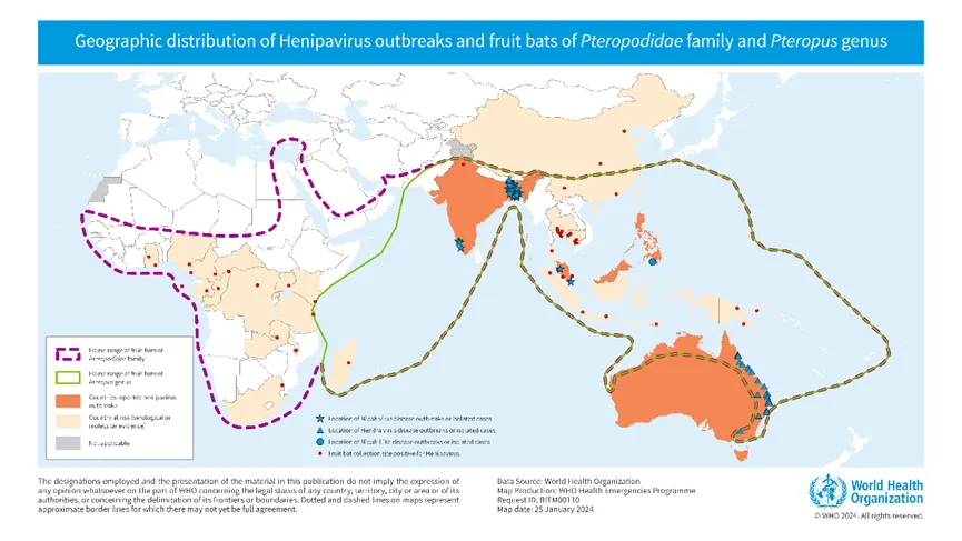 图1. 亨尼帕病毒属病毒天然宿主分布和相关疫情暴发示意图。图源:cdn.who.int