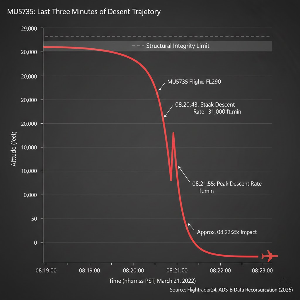 巡航高度的突变: 飞机在29,100英尺高度平稳飞行时,突然开始俯冲。专业飞行员指出,若非飞行控制系统遭遇极端故障(如水平安定面失控),飞机绝不会展现出如此完美的“垂直弹道”。