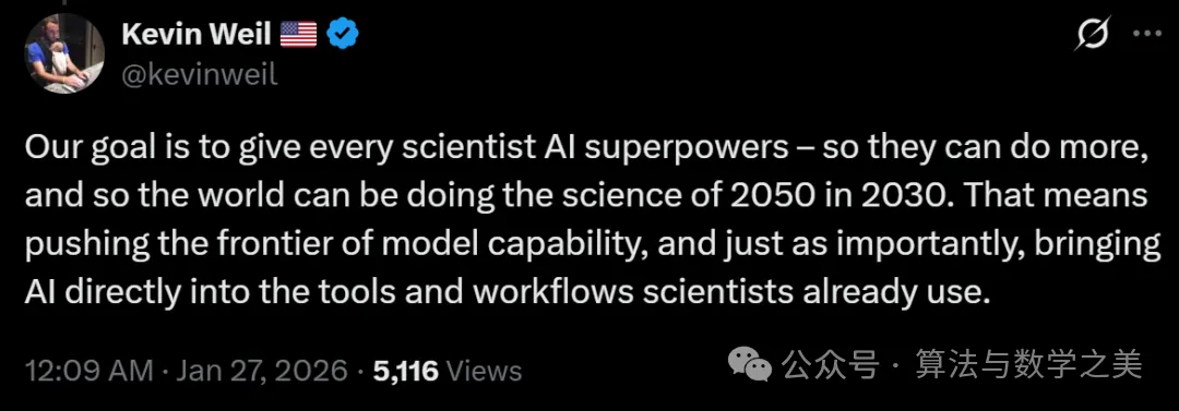 而在昨日,OpenAI 副总裁、新成立的 OpenAI for Science 团队负责人 Kevin Weil 就在 X 上发文预热道,“我们的目标是赋予每位科学家 AI 超能力,让他们能做更多事情,让世界在 2030 年就能开展 2050 年的科学研究。”