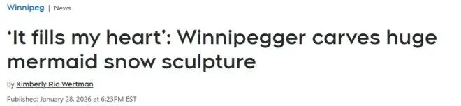 这座大型美人鱼冰雕于2026年1月28日出现在温尼伯的社区街头,吸引了不少邻居围观。