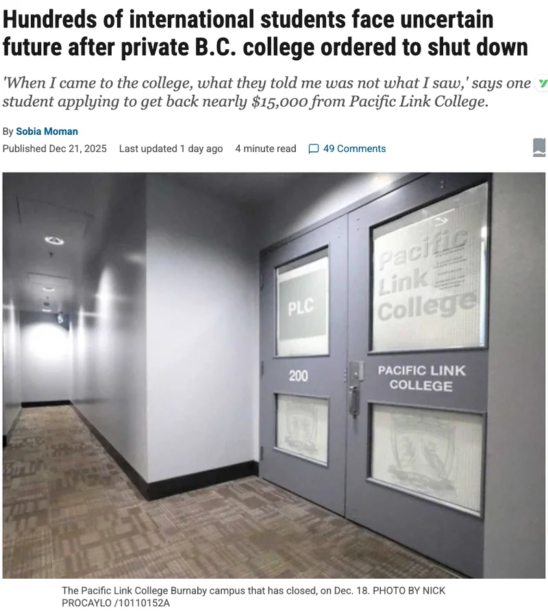 加拿大一所大专院校近日被勒令关门,数百名国际留学生面临前途未卜的未来。