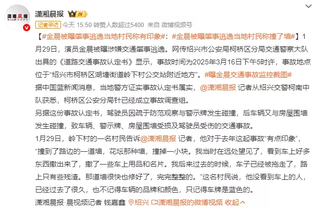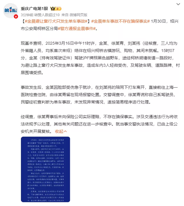 根据官方通报,2025年3月16日,金晨与经纪人刘某、助理徐长青一行三人在绍兴柯桥古镇游玩,15时许,为避让窜行犬只发生单车事故,车内三人轻微受伤。路旁车辆、路牌和围墙受损。