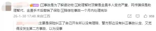 金晨同时对助理承认自己驾驶的行为归因于“事发突然,加上当时情绪紧张”。而她本人在手术结束意识恢复后,第一时间联系保险公司申请撤销理赔,并自行全额承担了所有车损费用、路边设施和房屋围墙相关方的经济损失。赔付已于2025年4月完成。