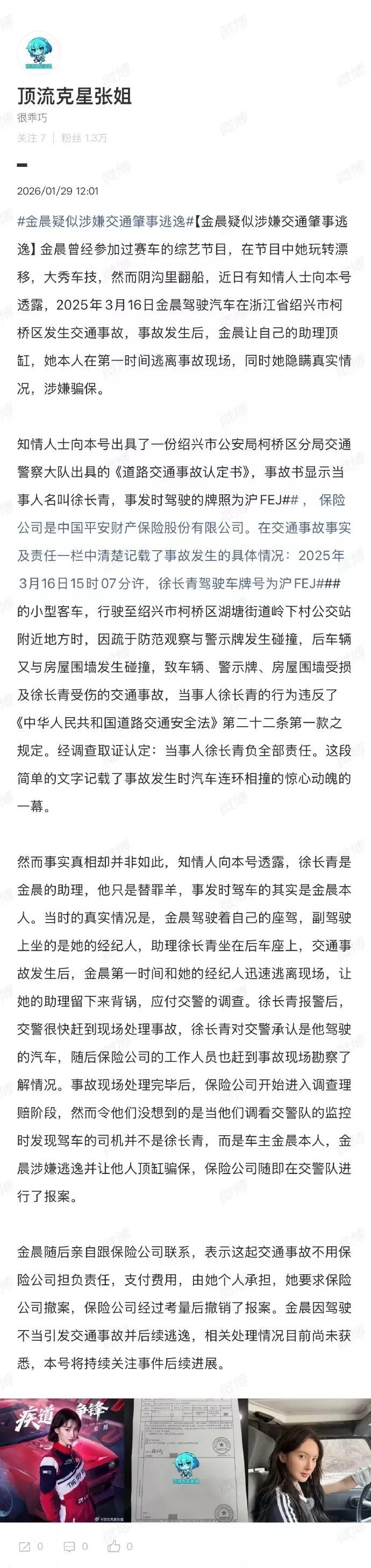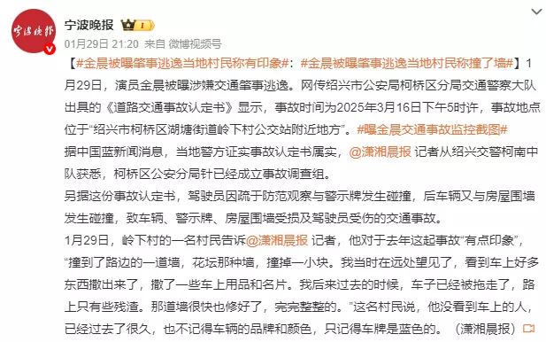 1月29日中午,有网帖爆料,女星金晨疑似涉嫌交通肇事逃逸。词条“曝金晨肇事逃逸”瞬间抢占热搜。