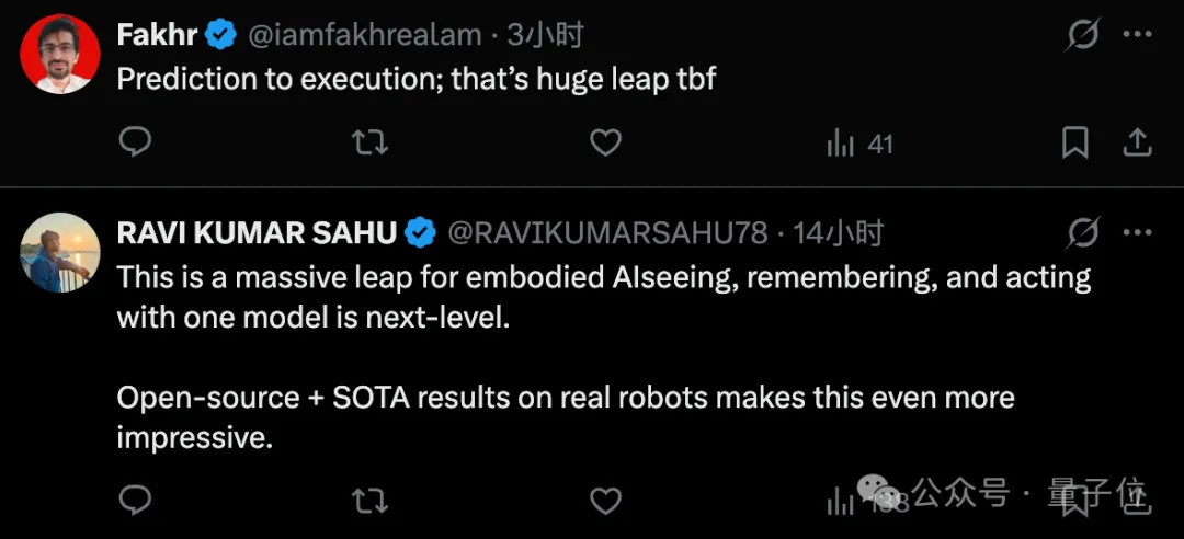 记忆不丢失:做长序列任务(比如做早餐)时,它会记得自己刚才干了什么,状态感知极强。高效泛化:只要给几十个演示样本,它就能适应新任务;换个机器人本体,也能hold住。