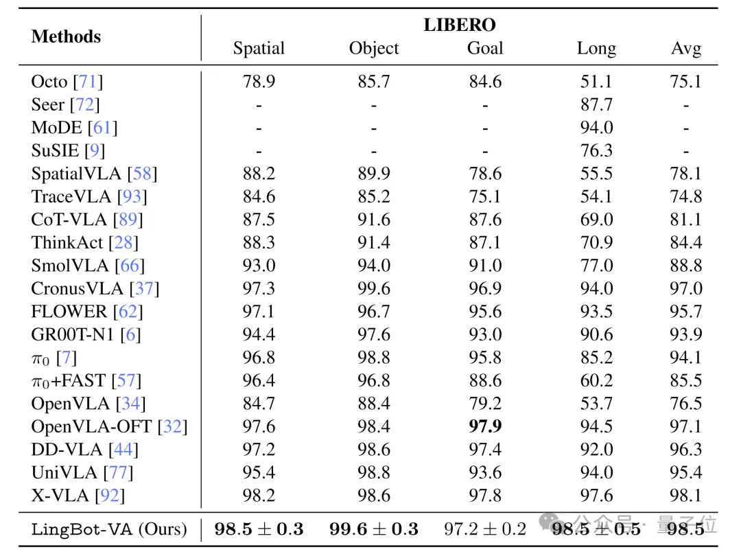而在LIBERO基准测试中,LingBot-VA更是拿下了98.5%的平均成功率,刷新了SOTA记录。