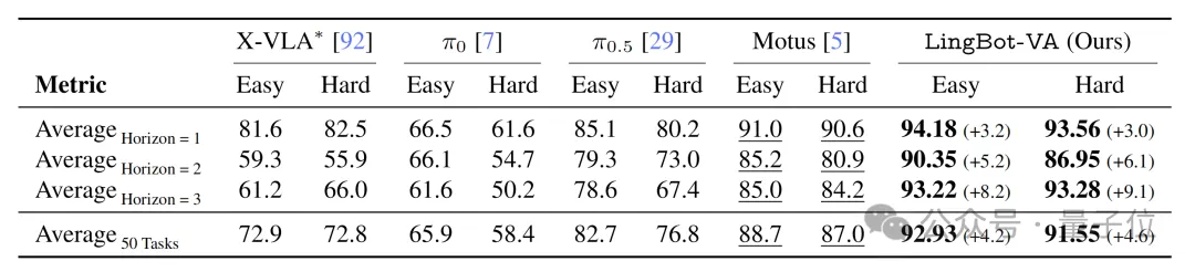 尤其是在RoboTwin 2.0的双臂协作任务中,无论是简单的固定场景(Easy),还是复杂的随机场景(Hard),LingBot-VA都展现出了不错的实力: