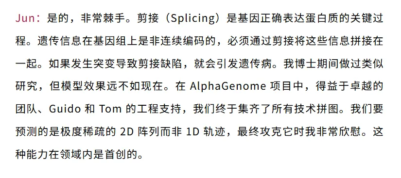 其次,我们对训练数据采取了“冷酷”的筛选标准,通过多轮质量检查,确保数据要么具有极高质量,要么能增加模型的多样性,从而提升泛化能力。搞定数据后,我们终于能高效迭代模型。在完善了 1D 轨迹预测后,我们转向了更具挑战性的 2D 数据——染色体接触图和 RNA 剪接。Jun,你在剪接方面投入了大量精力,那真是个棘手的问题。