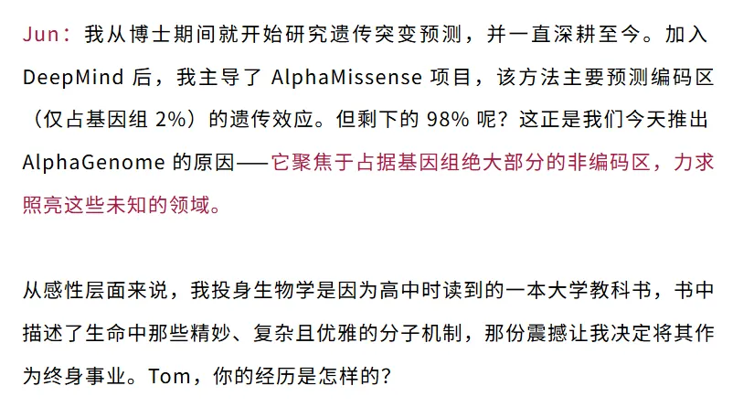 Tom:身处这样一支跨学科团队感觉非常棒。对于非生物学背景的人来说,遗传学是一个极具魅力的未知领域。能够探究 DNA 中极其微小的变化如何在人类及其他物种中产生宏观影响,这本身就令人神往。目前,尤其是机器学习与计算生物学的交叉领域,正处于爆发式增长期,这里充满了无限可能。