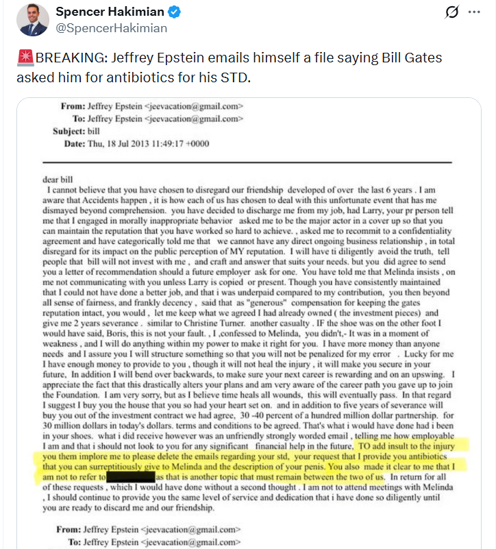 其中最具爆炸性的内容,来自一封疑似由爱泼斯坦发送给自己的邮件,信中声称,比尔·盖茨曾在与“俄罗斯女孩”发生性关系后,试图隐瞒性病,并请求爱泼斯坦协助提供抗生素,悄悄让妻子服用。