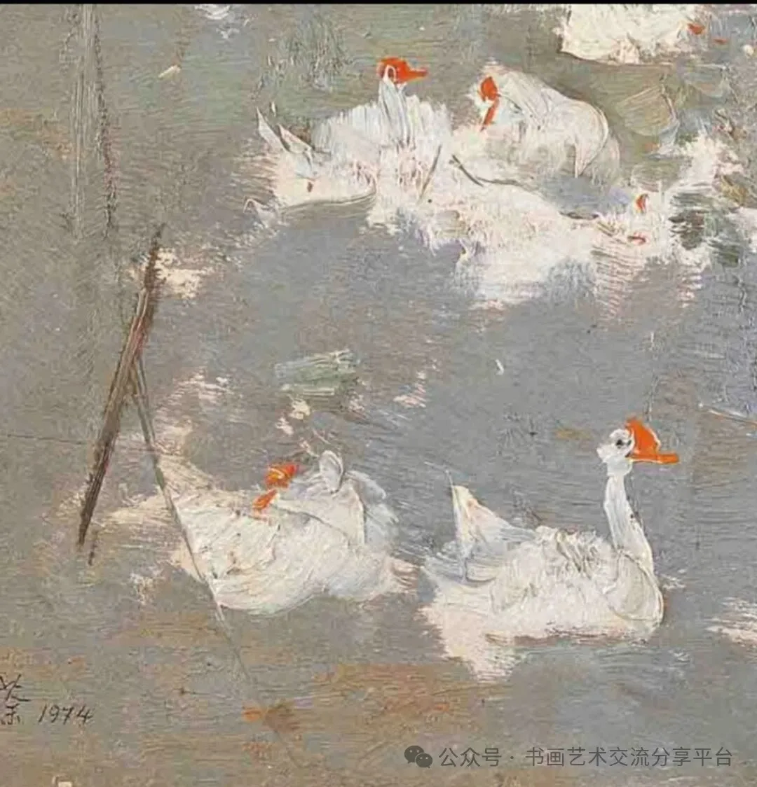 而《太湖鹅群》更是其油画民族化的里程碑,他以“点白成鹅”的写意笔法,将水墨的酣畅与油画的光影质感相融,朱红小点的跃动、白色块面的堆叠,勾勒出江南水乡的灵动,打破了苏式写实油画的单一框架,让油画拥有了中国文人画的写意精神。此外,他的创作始终扎根中国乡土,江南水乡、北国村舍、长城废垣等本土题材,成为其民族表达的载体,让作品充满了浓厚的中国生活气息。