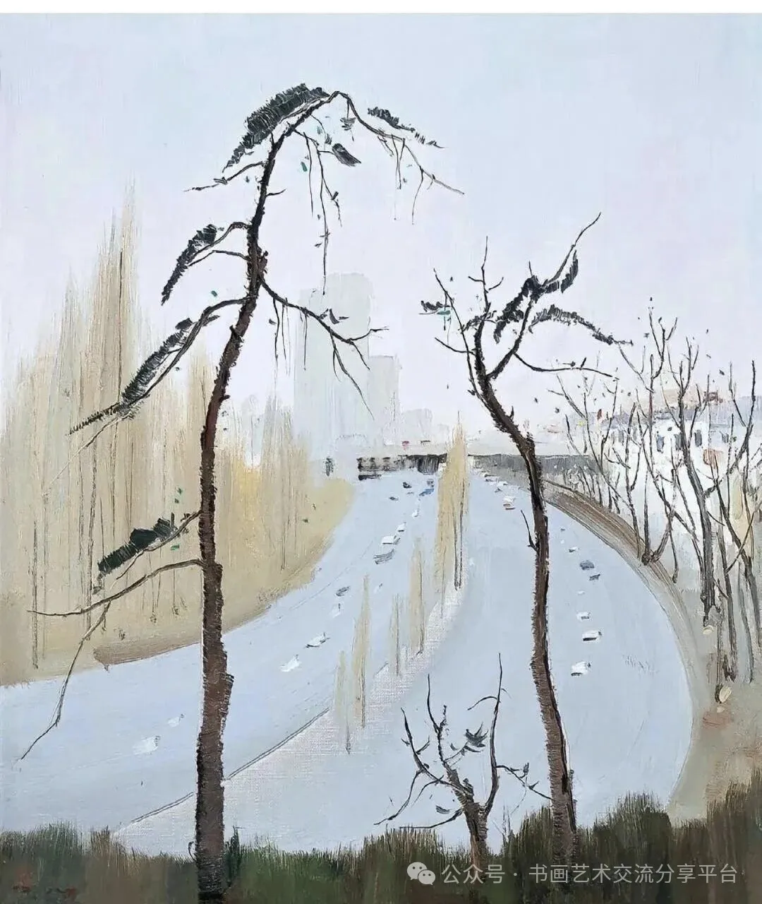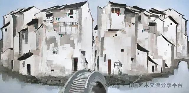 吴冠中油画的民族特色,根植于对中国传统美学的创造性转化,体现在构图、技法与意境的多重融合之中。他突破西方油画的焦点透视,将中国山水画的“散点透视”与“移步换景”融入创作,如《鲁迅故乡》中,他重组水乡不同时空的拱桥、黑瓦白墙与远山,以全景式构图营造出中式山水的空间意境,呼应了石涛“搜尽奇峰打草稿”的创作理念。在视觉表达上,他借鉴中国水墨“墨分五色”的精髓,以银灰色调统摄画面,通过留白营造空灵感,同时将具象景物提炼为点、线、面的几何形态,让白墙黑瓦的色块对比、树枝流水的线条交错,成为兼具形式美与东方韵味的视觉语言。