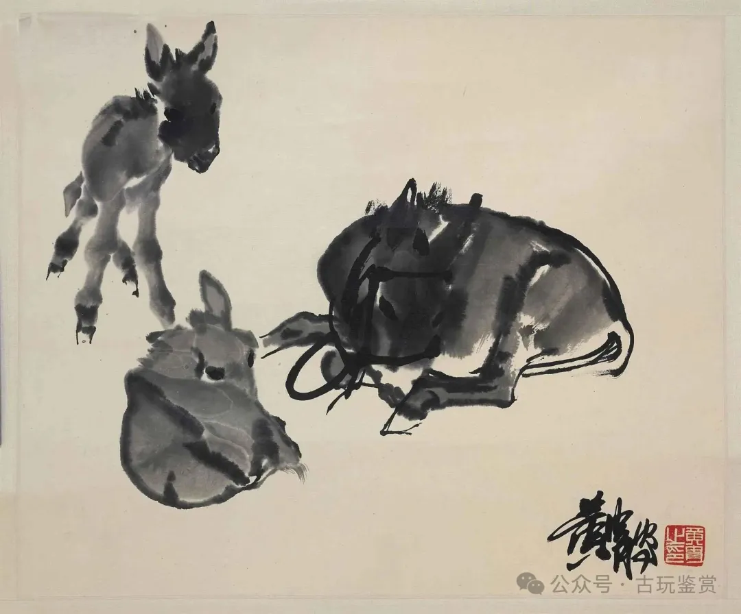 黄胄善于用速写的表现手法抓住人物或动物的特征,线条流畅有力,风格奔放。“驴”是黄胄绘画创作中的题材之一,他画的驴造型准确生动,手法简练概括,去掉了许多烦琐的细节,弱化了明暗和体积感,突出了驴的生动性和笔墨的自由流畅,使笔和墨活了起来,手法高超,笔法奔放,墨色变化丰富,简练精准。这里着重说说他画驴。在黄胄动物画的题材中以画驴最负盛名,黄胄画驴,形神兼备,确实是对前代的一种突破。一方面他保持了中国画用线的优势,而毛驴身上看似毫不经意的侧笔皱擦,令画面巧拙相称,充分体现了水墨写意的特点。同时体现出了黄胄对西方写实精神的理解,像毛驴身上表现出的转折明晰,简洁精炼的块面造型,使毛驴不仅富有情趣,且具有相当独特的体积感,这与画家融贯中西的创作观念是密切相关的。