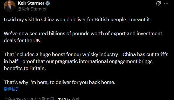31日一早,斯塔默在社交媒体X平台发布推文,总结此次中国之行。