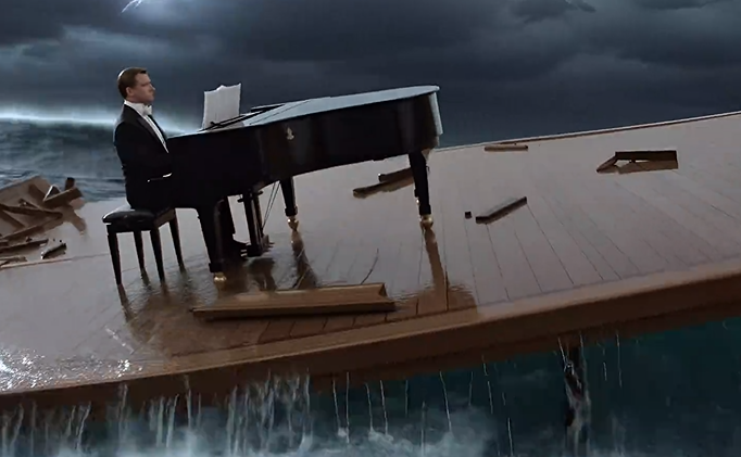 其他人都在逃命,唯有一名中年男子安坐在钢琴前演奏,钢琴声、海浪声交织在一起,营造出史诗般的叙事张力。