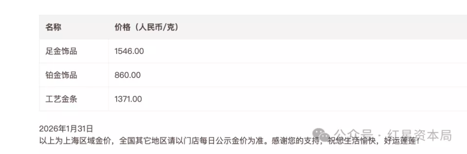红星资本局查询发现,到今日上午,周大福已调价为1625元/克、周生生报价1618/克,老庙黄金更是下跌至1546元/克,一夜之间每克暴跌122元。