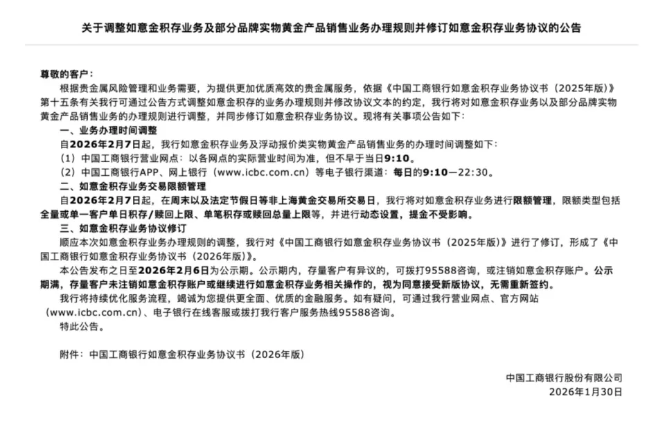 1月30日下午,中国工商银行发布公告称,自2026年2月7日起,在周末以及法定节假日等非上海黄金交易所交易日,工行将对如意金积存业务进行限额管理,限额类型包括全量或单一客户单日积存/赎回上限、单笔积存或赎回总量上限等,并进行动态设置,提金不受影响。