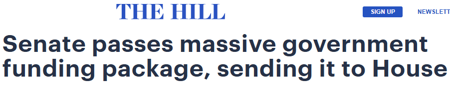 参议院周五以压倒性票数通过了一项重大拨款方案,该方案由5项常规拨款法案以及一项为国土安全部(DHS)提供为期两周的临时拨款措施组成。但由于时间问题,该立法无法在午夜前生效,联邦政府的部分机构仍将进入停摆状态。