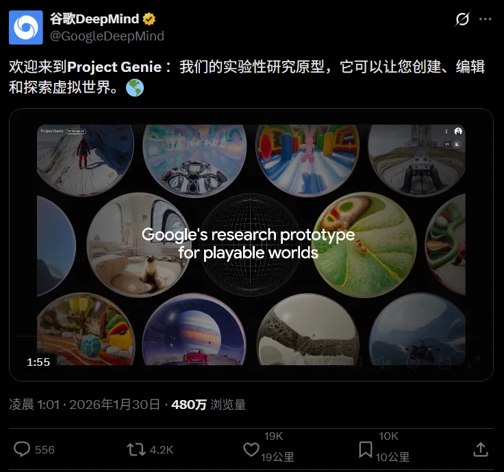 Project Genie 推出即爆火,谷歌 DeepMind 官推十二小时狂卷四千多转发,近两万赞,一万收藏。